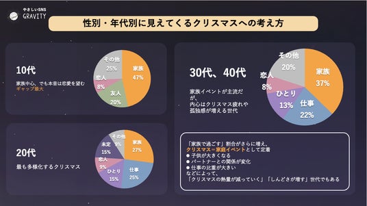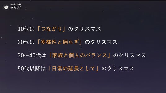 10代は「つながり」のクリスマス、20代は「多様性と揺らぎ」のクリスマス、30~40代は「家族と個人のバランス」のクリスマス、50代以降は「日常の延長としてのクリスマス」