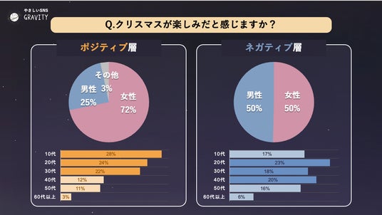 楽しみにしているのは圧倒的に女性(7割)、男性は全体比で楽しみ層の割合が下がっていました。男性はクリスマスへの熱量が女性に比べて低い傾向に あり、逆にネガティブな層は男女半々で20代、40代が多い結果に。 ネガティブ層の20代は一人で過ごすか仕事、40代は家族と過ごすもネガティブに出たことで「家族=ポジティブ」とも限らないようです。