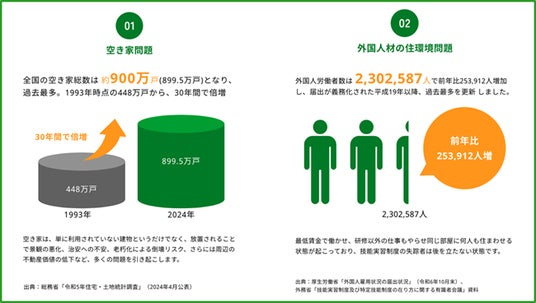 総務省の調査によれば、国内の空き家数は約900万戸と過去最多を記録しており(※1)、喫緊の社会課題として顕在化しています。一方で、国内の外国人労働者数も約230万人に達し、過去最高を更新し続けています(※2)。こうした就労拡大に伴い、外国人材を受け入れるための住環境整備へのニーズは急速に高まっています。