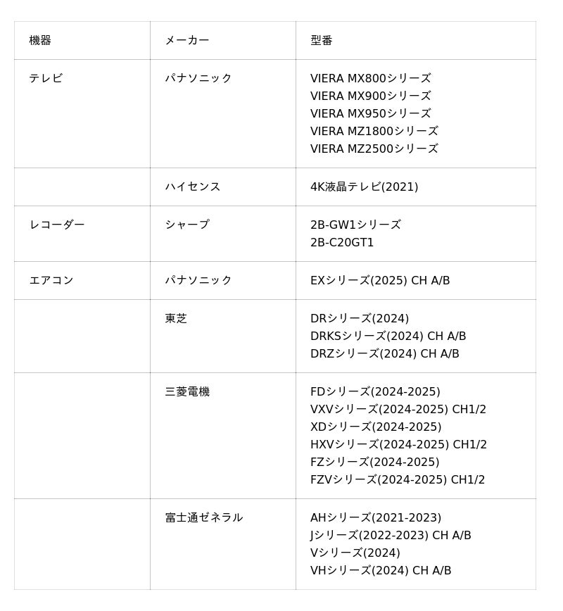 今回のアップデートでは、テレビ、レコーダー、エアコンの対応機種が追加されました。スマート家電リモコンの対応機器は、今後も随時増えてまいります。