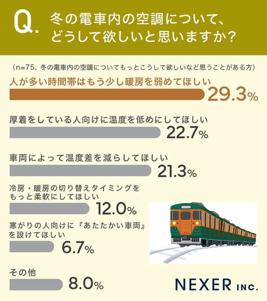 ■29.3%が、冬の電車内の空調について「人が多い時間帯はもう少し暖房を弱めてほしい」と回答