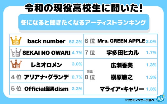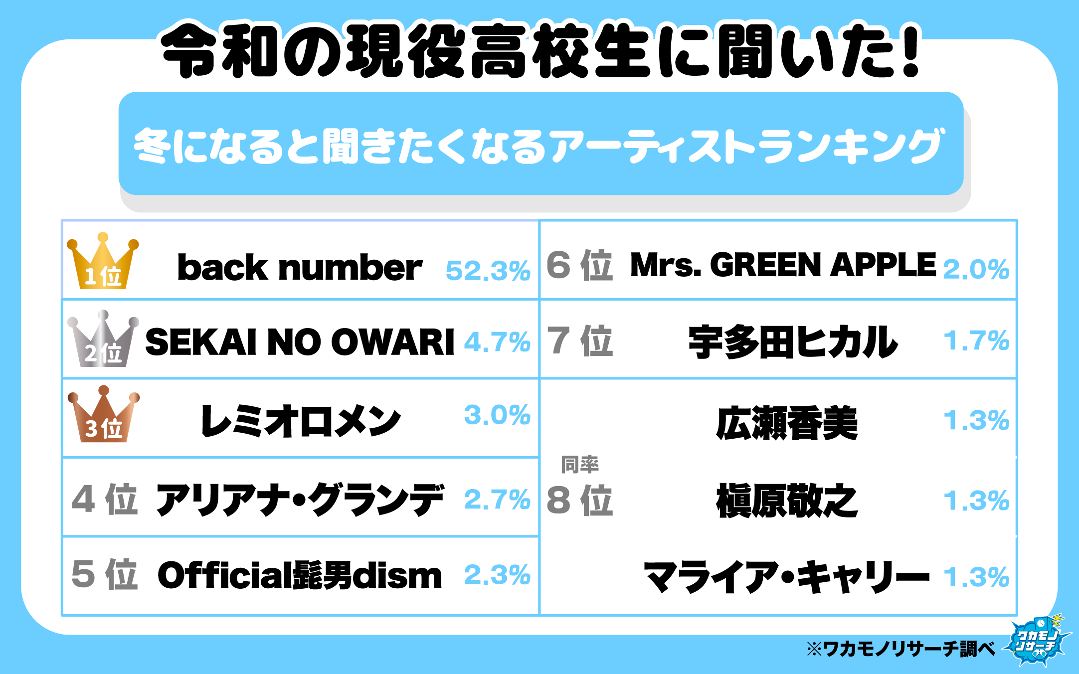 令和の現役高校生に聞いた!冬になると聞きたくなるアーティストランキング第1位 「back number」(52.3%)