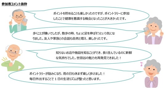 せたがやデジタルポイントラリーは、コロナ禍を通じて外出を控えがちになった高齢者に、積極的に外出し、歩くことを通じて人との交流・地域活動への参加に繋がるよう、外出することがインセンティブとなる事業です。令和5年度より区内3地区で試行実施し、令和6年度より区内全地区で実施しております。令和7年度は、歩数計測もできるようアプリを改修や期間限定の臨時スポットを設定するなど、参加者の方が継続して楽しんで参加していただけるよう工夫いたしました。本事業を通じ、外出を動機づけることで、介護予防の機会拡充及びデジタルデバイドの解消等を図ってまいります。