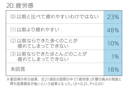 疲労感・自殺念慮・食欲の変化・興味喪失の順で腰痛との因果関係が強い