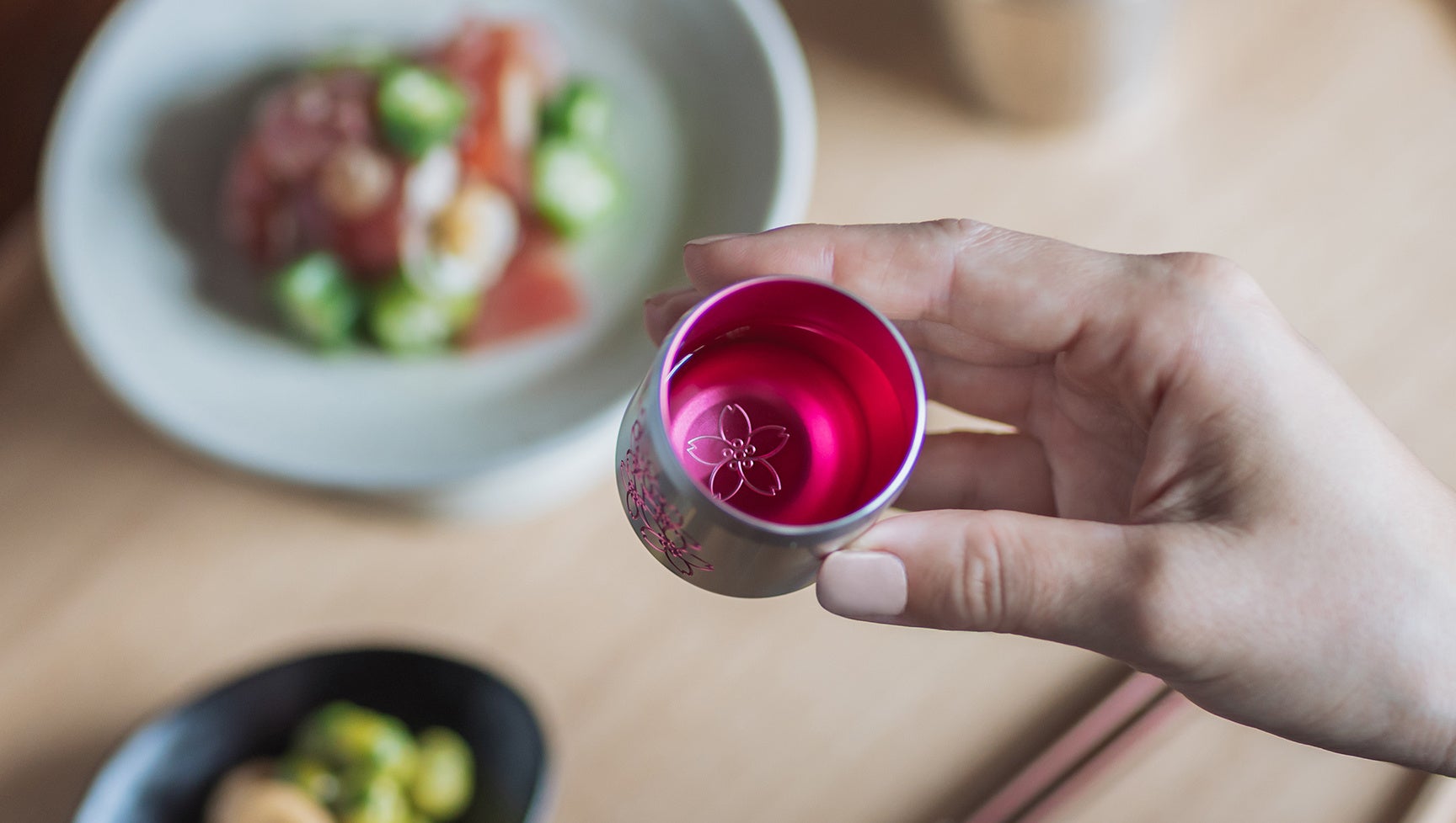 季節ごとの変化や風情を大切にする日本文化の趣を酒器へ。内側のカーブや表面のテクスチャーは、すべて削りの技術によって生み出されています。