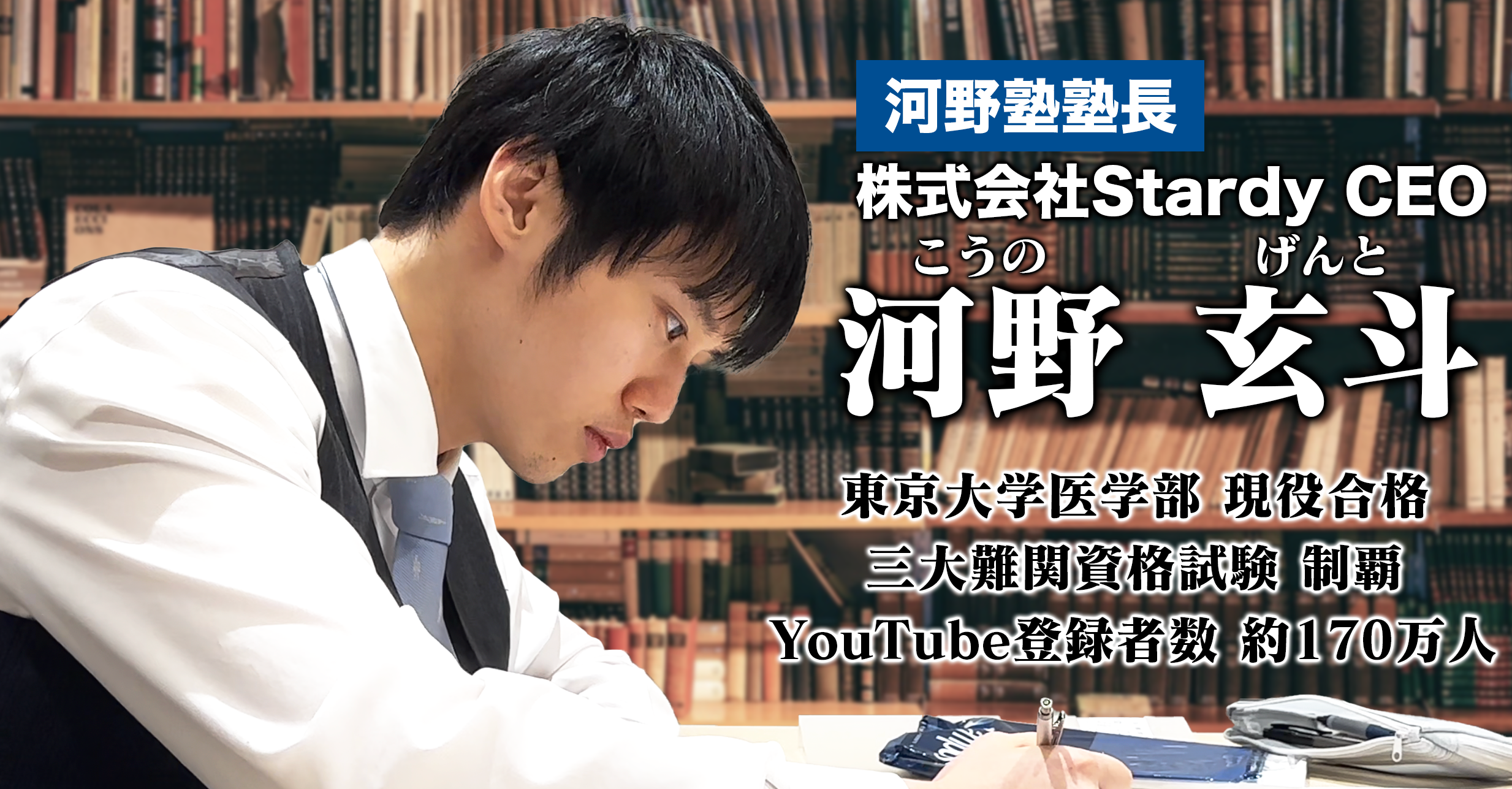 河野は、東京大学理科III類医学部に現役合格。在学中に司法試験に合格し、医師国家試験にも合格。2022年、公認会計士に挑戦し11月資格を取得。同年、河野塾を開校。「東大医学部の神脳」と呼ばれた東大医学部在学中から教育系YouTuberとして『Stardy -河野玄斗の神授業』をスタート。タレントとしても各メディアに出演。河野のYouTubeは登録者数170万人(2025年12月現在)を誇り、今も自ら学び挑戦する姿に多くの支持を得ています。