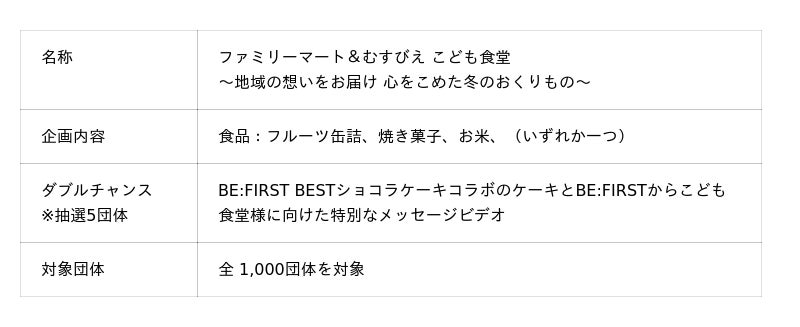 また、今年はダブルチャンスとして、ファミリーマートの大人気クリスマスケーキ「BE:FIRST BESTショコラケーキ」を、抽選で5団体様限定で、BE:FIRSTからこども食堂へ向けた特別なメッセージビデオと共にお届けいたしました。