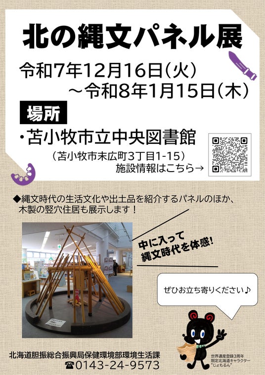 縄文時代の生活文化を紹介するパネルや、世界遺産登録3周年記念北海道キャラクター「じょもるん」が縄文時代を旅する絵本のパネルのほかに、高さ約2メートルの木製竪穴住居を展示します。