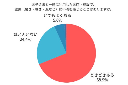 お子さまと一緒に利用した施設で空調に不満を感じることがあるかを尋ねたところ、「ときどきある」が68.9%、「とてもよくある」が5.6%となり、合わせて約75%のママ・パパが不満を感じた経験があることが分かりました。