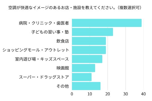 空調が快適なイメージのある施設を尋ねたところ、「病院・クリニック・歯医者」が39回答で圧倒的多数となりました。