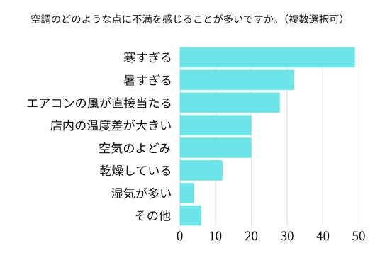 また、「エアコンの風が直接当たる」が28回答となり、温度だけでなく風向の配慮も求められていることが分かりました。