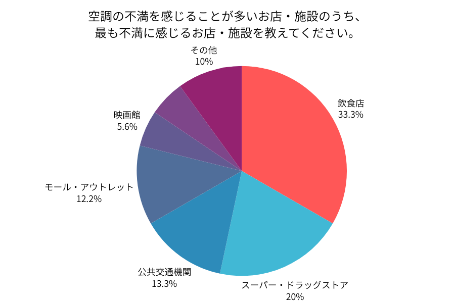 一方、最も不満を感じる施設を単一回答で尋ねた設問では、飲食店が33.3%でトップとなったものの、「スーパー・ドラッグストア」が20.0%で2位に浮上し、毎日の生活に身近な場所ほど、空調への不満が目立つ結果となりました。