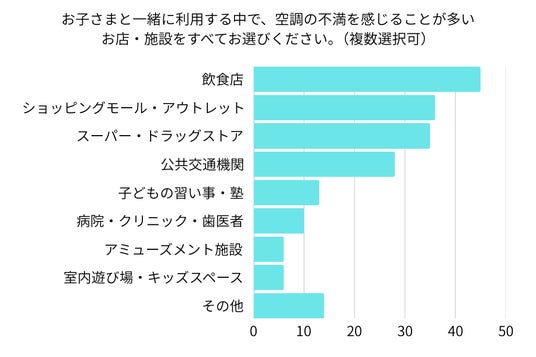 空調の不満を感じることが多い施設を複数回答で尋ねた結果、「飲食店(ファミレス・カフェ・ファストフードなど)」が45回答で最も多く、次いで「ショッピングモール・アウトレット」が36回答となりました。