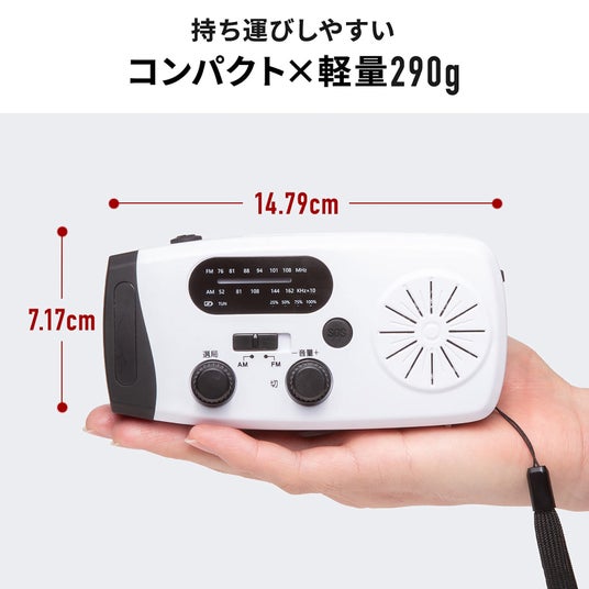 シンプルなボタン配置で、直感的に操作できる構造を採用しています。防災グッズは“誰でも使える”ことが重要なため、高齢者や機器に不慣れな方でも安心です。また、重さ約290g、手のひらサイズのコンパクト設計で、非常用持ち出し袋にもすっきり収納できます。アウトドアや車中泊の持ち運びにも最適です。
