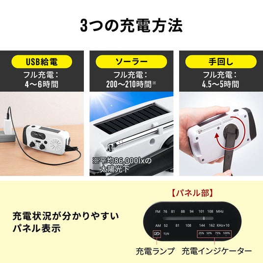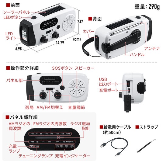 ・電池不要の3WAY充電(手回し・USB・ソーラー)で非常時も安心・LEDライト・ラジオ・スマホ充電・SOS警報を1台に集約
