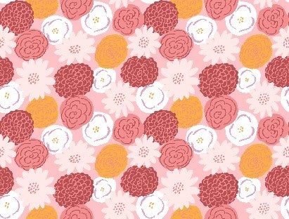 ピンクの背景に、バラやトルコ桔梗、カーネーション等を柔らかなタッチで描いた華やかなデザイン。優しく温かみがあり、ギフトやインテリアにもぴったりです。