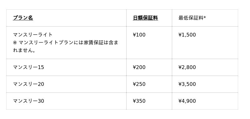 *最低保証料:契約日数が短く、日額計算の保証料が最低保証料を下回る場合に適用されます。