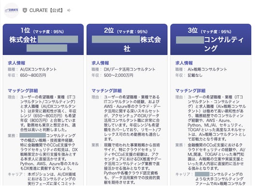 フェアテック株式会社(本社:東京都渋谷区、代表取締役:辰巳裕介)は、テスト版でご好評いただいた「CURATE(キュレート)」を、UI/UX全面リニューアルのうえ正式に提供開始します。本サービスは、主に20~30代のコンサルタント及びエンジニアの転職を支援する、無料のAIエージェントです。