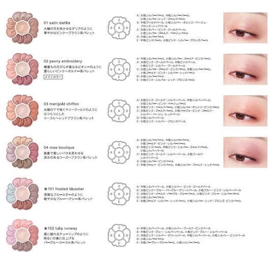 多彩な花びらがまぶたにとけ込む“重ね咲きアイ”。色×質感で瞳の印象も変える新アイカラーパレット。
