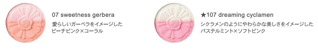 ふんわりとした彩りで、自然な血色感と明るさをあたえるチークカラーから、肌になじんで可憐な印象をもたらすピーチピンク×コーラルの新色と、春らしい彩りでやわらかな血色感を宿すパステルミント×ソフトピンクの限定色が登場。美しいグラデーションを活かし、自然に頬の毛穴や凹凸を光でぼかしてフィルターをかけたような肌に仕上げます。オイルコーティングを施したきめ細かいパウダーが、肌になめらかにフィット。しっとりととけ込むような高い密着感のある、負担感のないつけ心地です。透明感の高いクリアパウダーを配合し、白膜感のない仕上がりを叶えます。また、透明感のある明るいパステルカラーが頬にやわらかな彩りをあたえます。ブルーミングブラーパウダーが皮脂を吸収し、美しい仕上がりでしっとりとした保湿感が続きます。