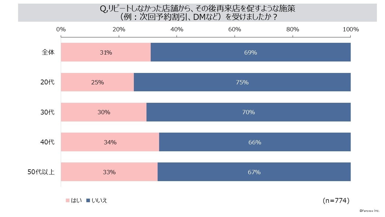 3.約7割が再来店を促す施策は行っていない。 クーポンなどで再来店のきっかけを作り、「スタッフへの信頼」を再構築することでリピーターへ