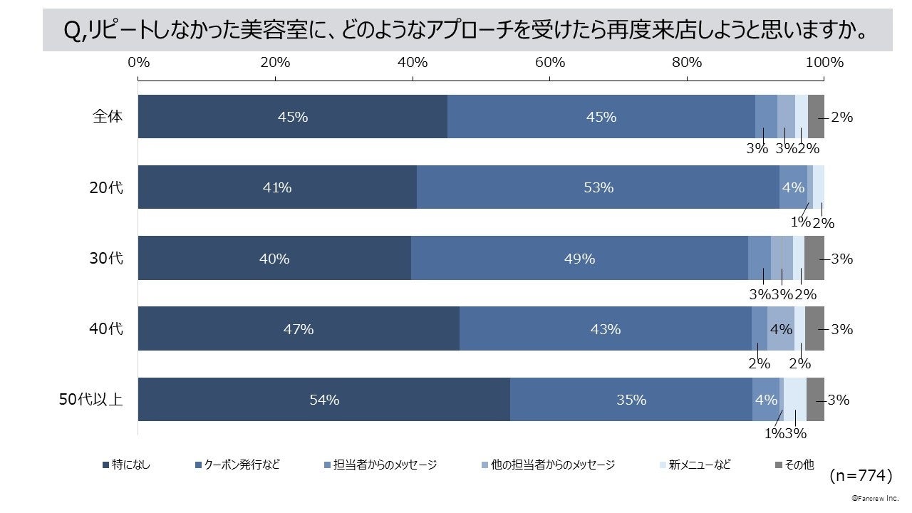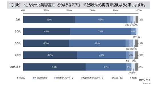 過去に美容室を「1回のみの利用で、その後リピートしなかった」経験がある方は82%にのぼりました。リピートしなかった最大の理由は「施術の仕上がり・効果」が51%と最多でしたが、「スタッフの接客態度・言葉遣い」や「店内の雰囲気・清潔感・設備」「価格設定」といった技術以外の要因を合算すると約半数に達し、技術力だけで顧客を繋ぎ止めることの難しさが浮き彫りとなりました。また、離脱した店舗からその後にアプローチを受けていないと回答した人は69%と、多くの店舗で離脱顧客へのフォローが手付かずとなっています。「クーポンの発行など」が45%と再来店へのアプローチとして効果的で、かつ、継続利用している店舗では「接客の距離感」や「気遣い」が高く評価されています。このことから、再来店へのきっかけ作りとしてクーポンの活用をし、その後の信頼関係の再構築がリピーター獲得へとつながります。