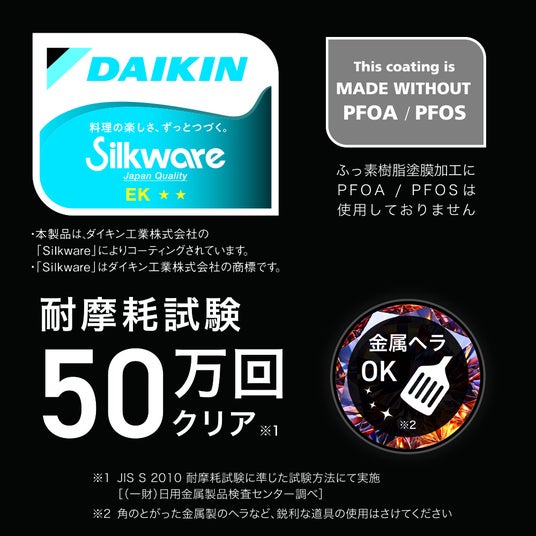 2.内面はシルクウェアEKダイヤモンドコート加工 内面は、こびりつきにくく金属ヘラも使える、耐久性に優れたふっ素樹脂塗膜加工。JIS S 2010に準拠した耐摩耗試験で50万回クリアしています。