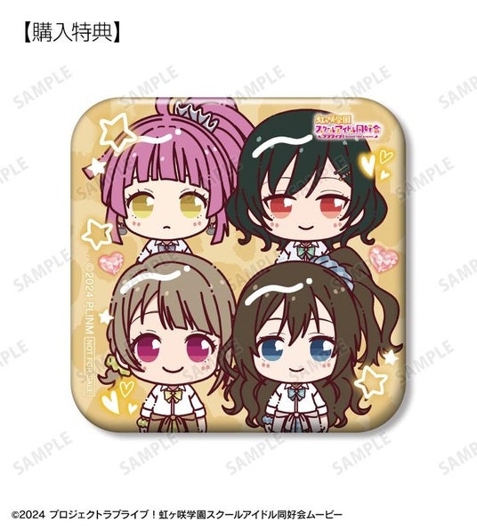 高咲 侑、上原歩夢、中須かすみ、桜坂しずく、朝香果林、宮下 愛、近江彼方、優木せつ菜、エマ・ヴェルデ、天王寺璃奈、三船栞子、ミア・テイラー、鐘 嵐珠がちょこんと立っているちびキャラを新たに描き起こし、スクエア缶バッジに仕上げました。