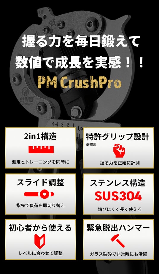 1台で“握力測定”と“トレーニング”ができる2in1構造「PM CrushPro」は韓国で話題の新型トレーニングギアで、