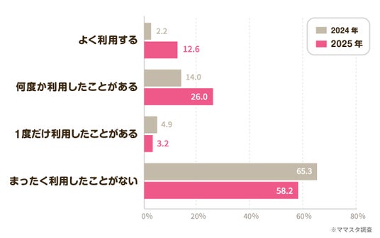 ママたちにAIを搭載したサービスの利用率を聞いたところ、「まったく利用したことがない」と回答した人が58.2%と最も多い結果になりました。ただ、2024年度に比べ「よく利用する」と回答したママは、2.2%から12.6%とジャンプアップ。「何度か利用したことがある」も、2024年の14.0%から26.0%に増加しました。全体ではAI未利用のママが多いものの、AIに関連するサービスは日常生活のなかで少しずつ浸透していっているのが伺えます。