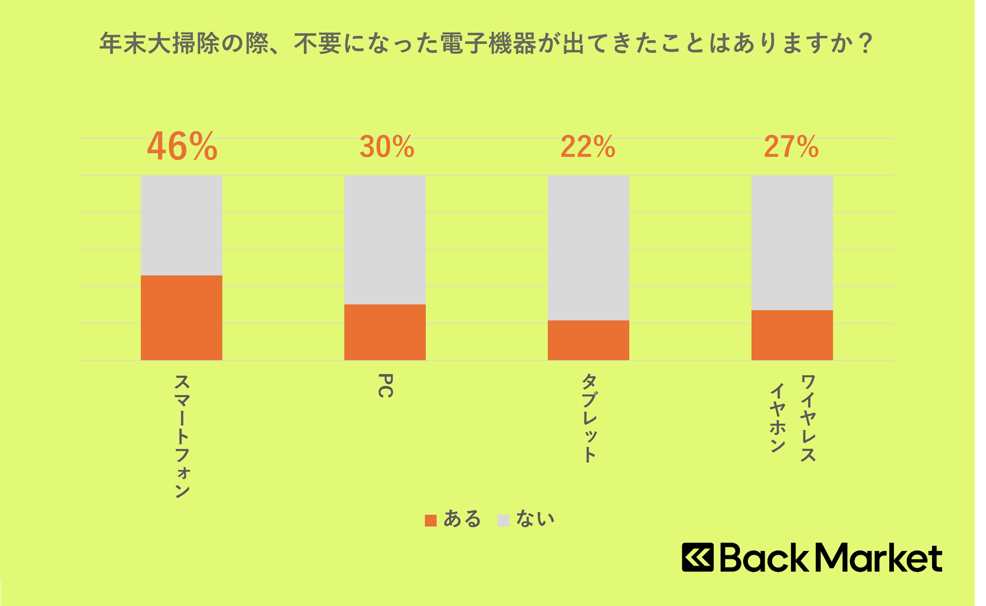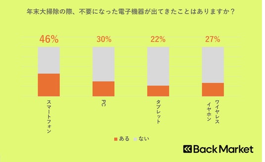 世界最大級のリファービッシュ電子機器に特化したマーケットプレイスであるBack Market Japan株式会社(本社:東京都渋谷区 以下、Back Market)は、全国の20~60代の男女1,000名を対象に、電子機器にまつわる年末大掃除時の意識調査を実施しました。また今回の調査結果をうけ、2025年12月26日(金)から2026年1月12日(月)までの期間限定で、Back Market買取サービスにおける買取金額を一律10%増額する「年末年始 買取10%増額キャンペーン」を開催します。年末の大掃除や新年のお片付けで見つかった、今まで使われていなかったスマートフォンやタブレット、パソコン、イヤホンなどを、よりお得に手放していただける機会としてご活用いただけます。リファービッシュ品とは、中古品として回収された電子機器を専門家が検査・クリーニング・修理し、全ての機能で正常作動が確認されている整備済製品です。