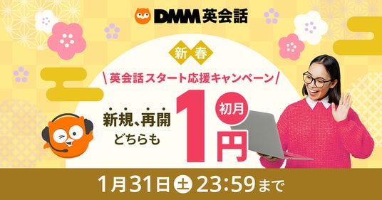 合同会社DMM.com(本社:東京都港区、PFカンパニーCEO:村中悠介、以下DMM)が運営する「DMM英会話」(https://eikaiwa.dmm.com/)は2026年の英会話スタートダッシュを全面的にサポートするため、1月1日(木)から1月31日(土)の期間中、「新春英会話応援スタートキャンペーン」を開催いたします。期間中、スタンダードプランまたはプラスネイティブプランに新規入会・再入会された方を対象に、初月の月額料金を特別価格の1円でご提供いたします。