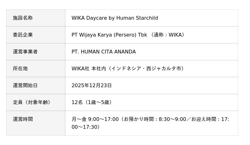 ヒューマンアカデミー株式会社の事業子会社で保育事業を展開するヒューマンスターチャイルド株式会社(本社:横浜市、代表取締役:川下 裕左、以下「当社」)は、ヒューマンホールディングス株式会社の子会社であるPT. HUMAN CITA ANANDA(本社:インドネシア・南ジャカルタ市、以下「HCA社」)が、インドネシアを代表する国営建設企業であるPT Wijaya Karya (Persero) Tbk(以下「WIKA社」)と契約を締結し、同社初となる企業内保育所の運営を受託したことをお知らせいたします。 本施設は、当社が日本国内で培ってきた高品質の保育を提供し、2025年12月23日より運営を開始いたします。