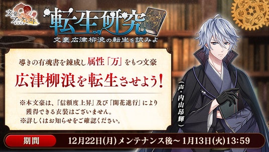新文豪「広津柳浪(CV:内山昂輝)」を期間限定で転生できるイベント『転生研究「広津柳浪」』を開始いたしました。