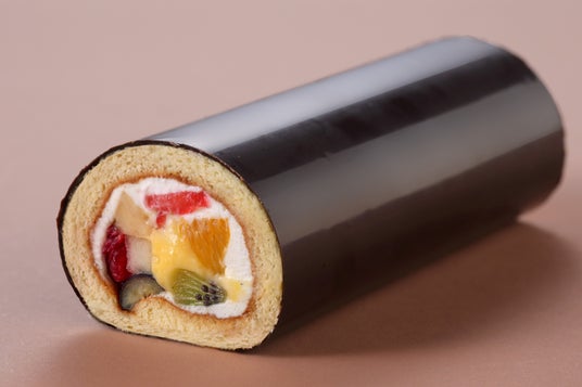 七福神にちなみ、いちごやキウイフルーツなど7種類のフルーツを入れたロールケーキを海苔に見立てたチョコレートで巻きました。