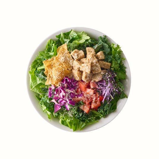 レタス3種とリーフミックス、レッドキャベツスプラウトをベースに、赤キャベツとトマトで彩りを添えています。濃厚なダブルチーズシーザードレッシングは、さっぱりとした葉野菜と相性抜群。トルティーヤチップスのパリパリ食感も楽しい、栄養満点のシーザーサラダです。
