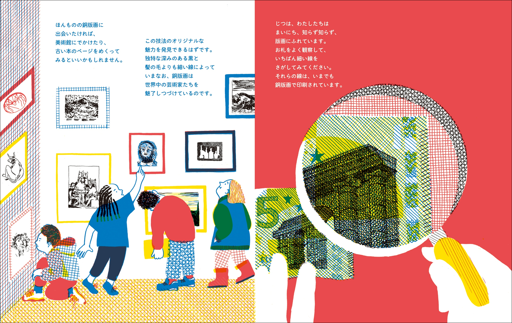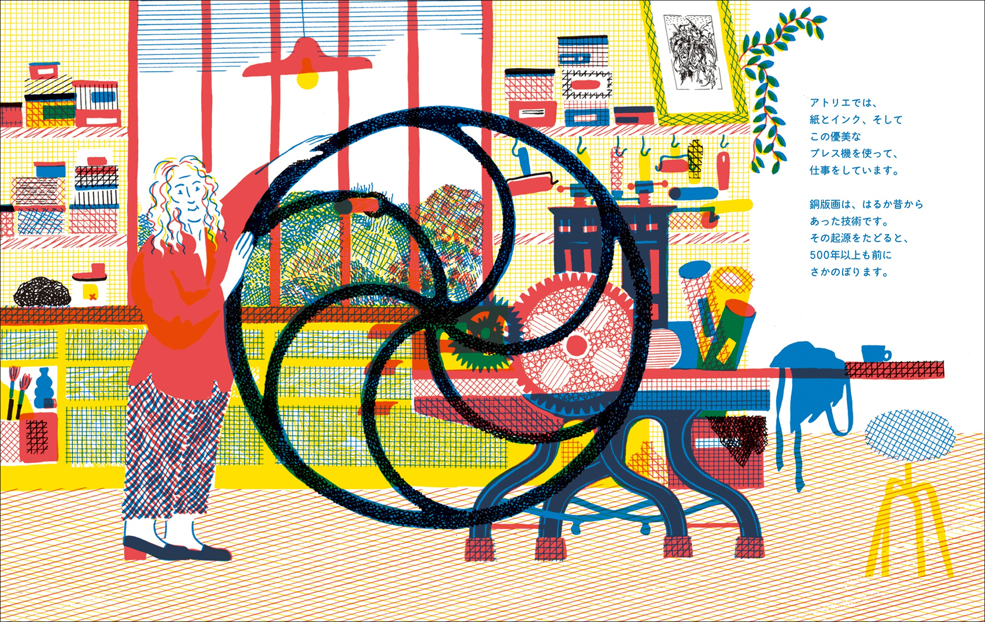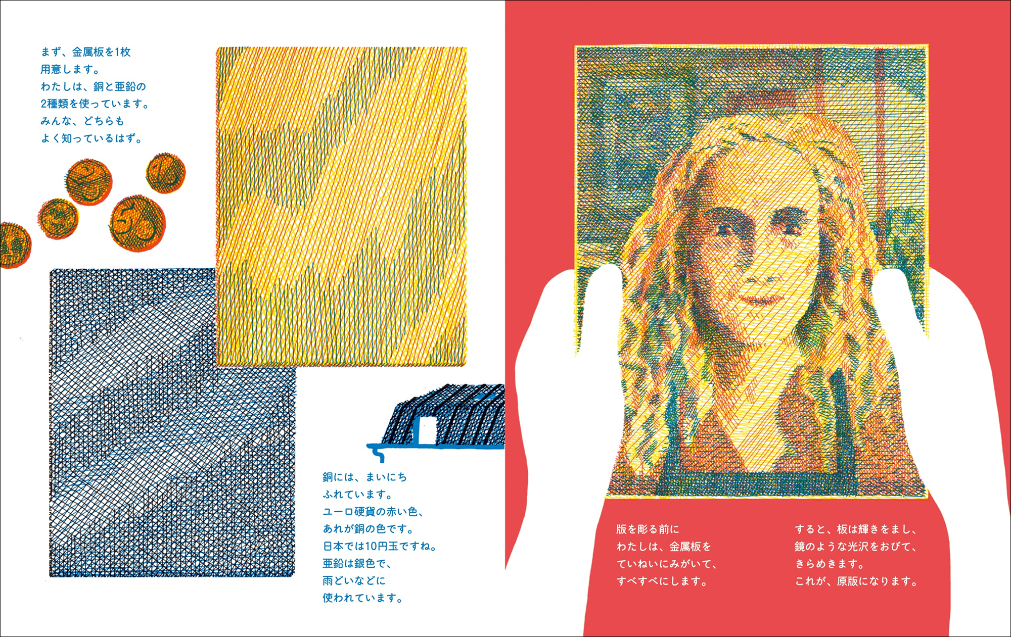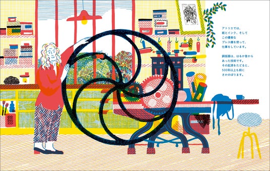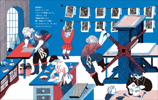 本書は、「絵本」でわかりやすく、中身は驚くほど本格的な「ノンフィクション」。とても難しそうな銅版画のプロセスを、緻密なイラストで分かりやすく解き明かします。