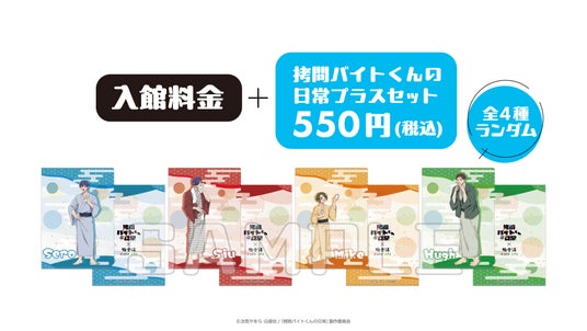店舗ご入館時に、入館料金+拷問バイトくんの日常プラスセットの料金をお支払いいただいた方に、描き下ろしイラストを使用したコラボ限定クリアファイルをランダムでお渡しします。