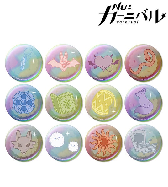 エイト、エスター、モルフィス、八雲、エドモンド、オリビン、ケシー、玖夜、ガル、ブレイド、エンテン、レイの描き起こしモチーフをオーロラ加工を施した缶バッジに仕上げました。