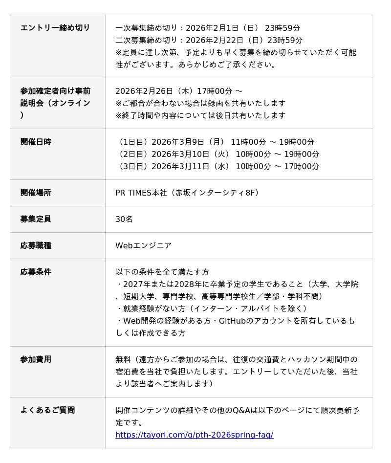 プレスリリース配信サービス「PR TIMES」等を運営する株式会社PR TIMES(東京都港区、代表取締役:山口拓己、東証プライム、名証プレミア:3922)は、2026年3月9日(月)、10日(火)、11日(水)の3日間、2027・28年卒業予定のエンジニア志望学生(*1)を対象とした「PR TIMES HACKATHON 2026 Spring」をPR TIMES本社(赤坂インターシティ)で開催します。