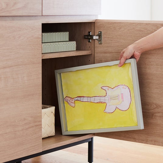 「収納しながらアートのように飾れる作品収納」は、「子どもの絵を飾りたいけれど、収納も難しく見栄えも気になる」という保護者の悩みに応えて開発されました。作品をきれいに展示できるアートフレームの役割と収納機能を兼ね備えています。しっかりとしたフレームは、八つ切り画用紙で最大25枚まで収納でき、透明のフタを開閉するだけで収納や作品を簡単に入れ替えることができます。また内寸の厚みが2cmあるため、画用紙などの平面作品だけでなく、折り紙など立体的な作品の収納にも活用可能。縦横どちらでも壁掛けできる仕様で、リビングにも馴染むギャラリーのような空間を演出します。