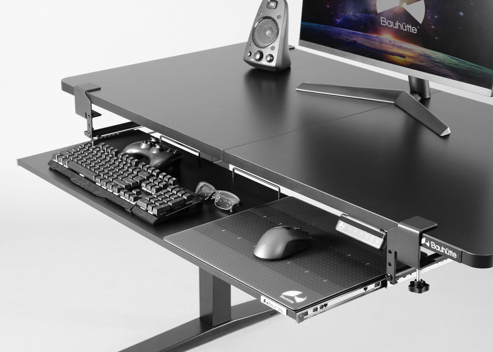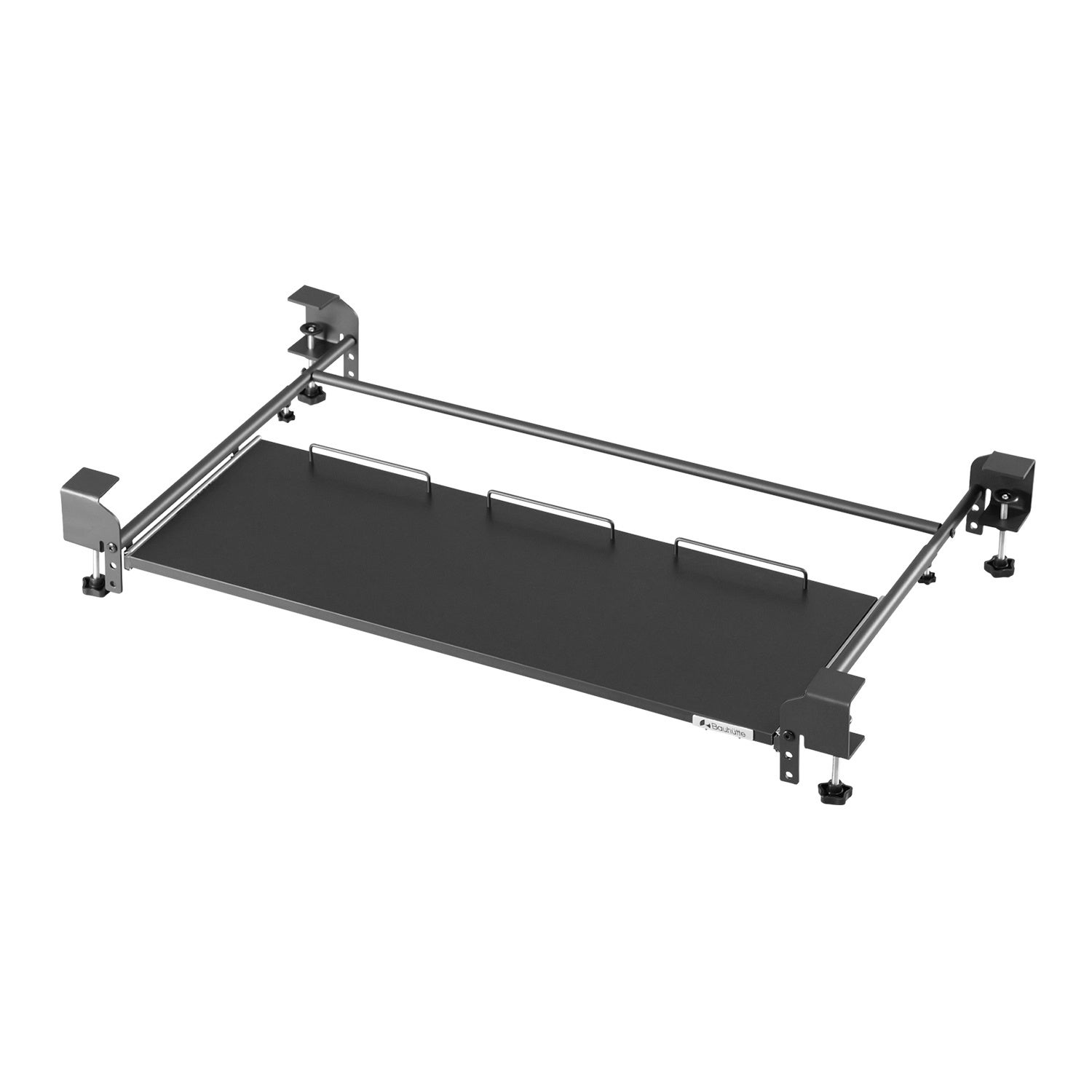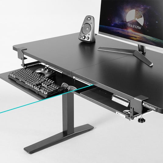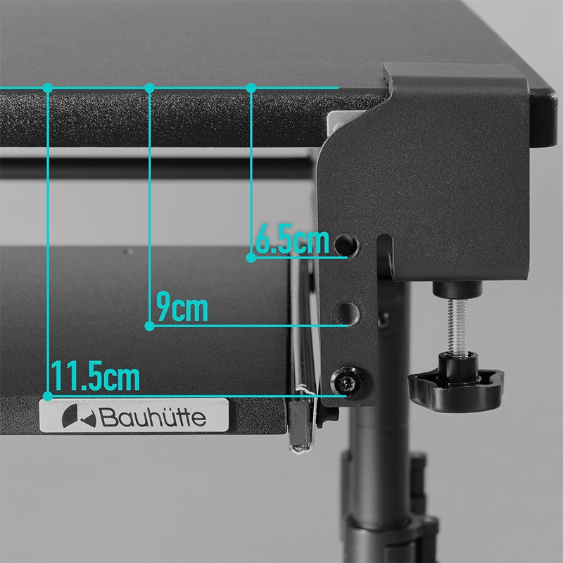 後付けキーボードスライダーの最大の課題である「使用時のグラつき」を徹底的に解消するため、バウヒュッテ独自の4点固定機構を旧モデルより踏襲。デスクの天板を挟み込むクランプ式を採用しているため、天板にネジ穴を空けずに強固に固定できます。