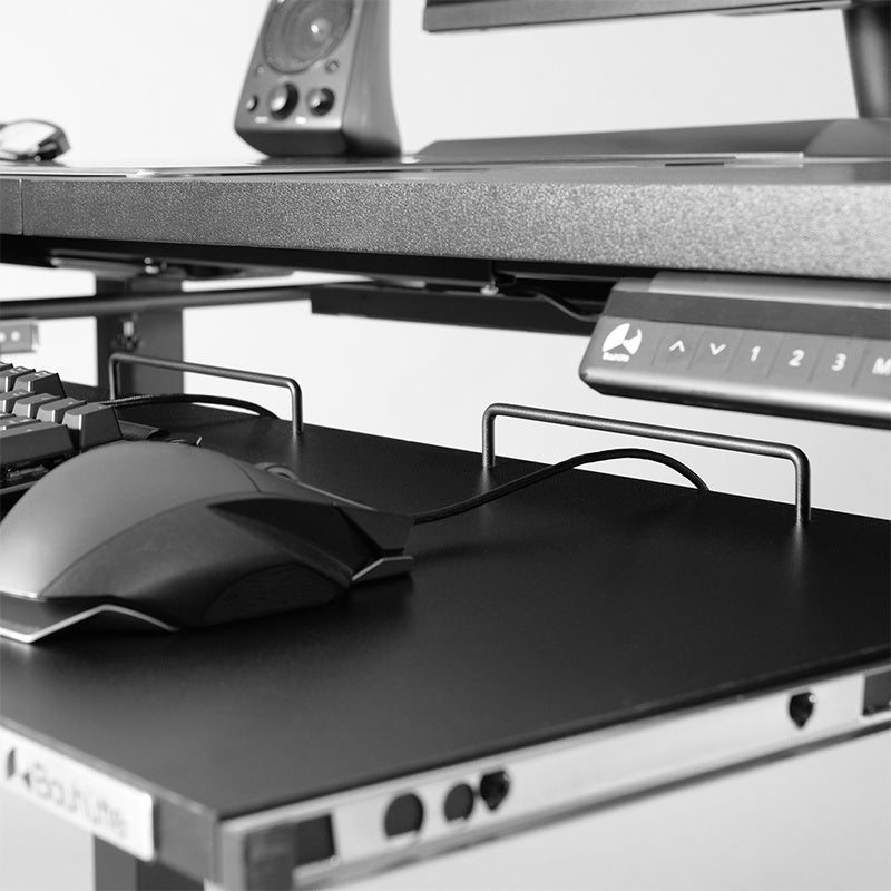 積載物の落下を防ぐストッパーを天板後部へ装備。キーボードやマウスの配線管理にも活用できる。