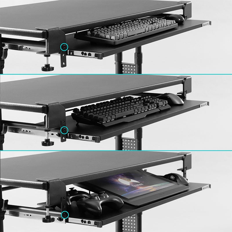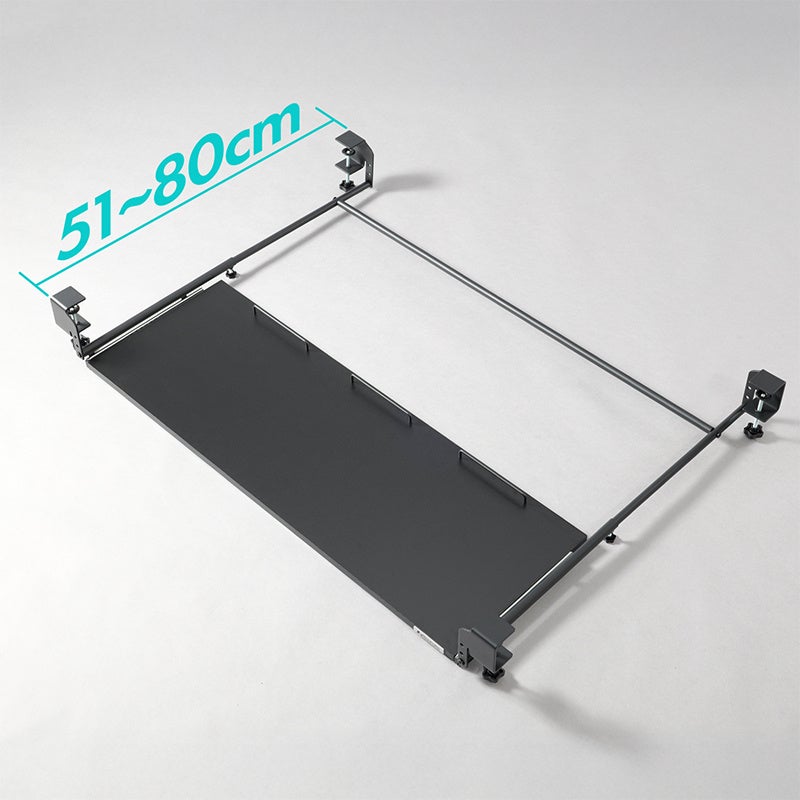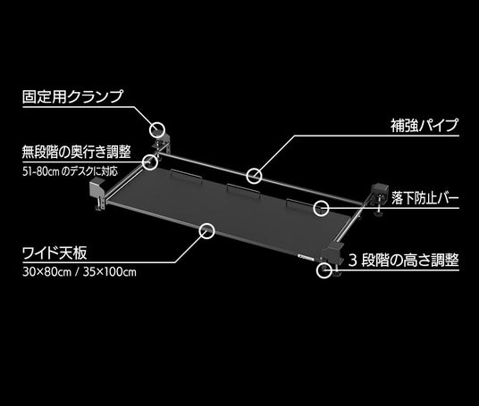 本製品は、最大横幅100cmという大型の天板をデスク下に追加することで、メイン天板を占有しがちなキーボードやマウスをスマートに収納。また、ただ広いだけでなく、タイピング時にもグラつかない4点固定による圧倒的な安定性を追求しました。高さは使用するデバイスや環境に合わせて3段階での調整が可能。さらに、取り付ける奥行きを51~80cmまで調整できるので、幅広いサイズのデスクへの取付けが可能です。