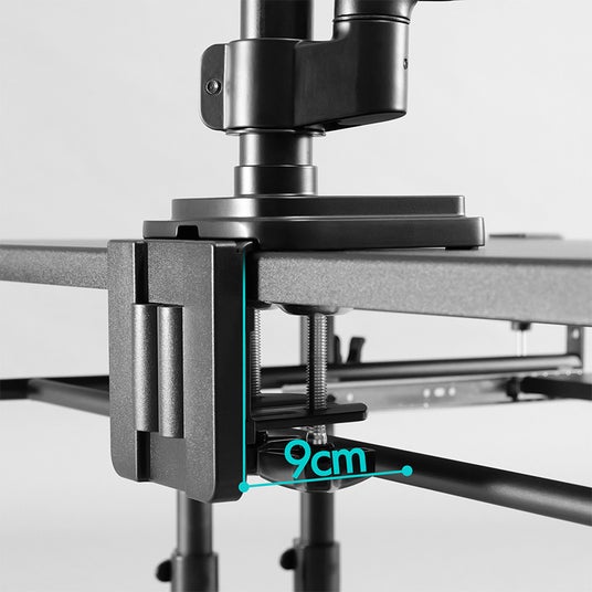 補強バーは天板端からずらして配備。モニターアームのクランプと干渉しない仕様。
