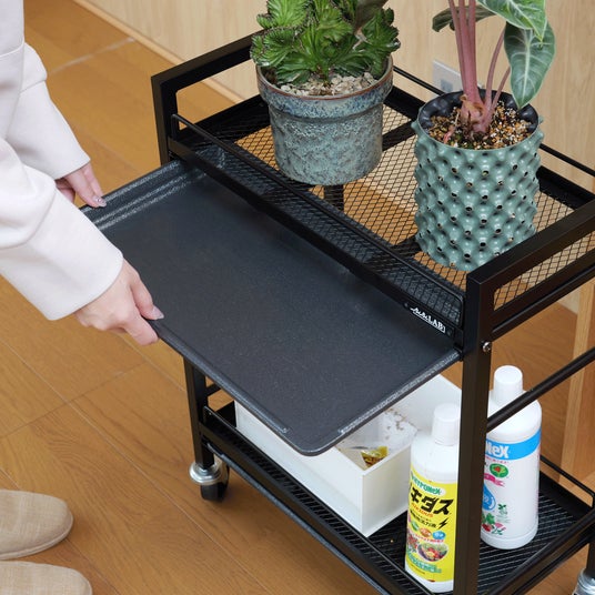 キャスターが付いたワゴンタイプの植物棚で、複数の鉢を同時に楽々移動できます。排水性・通気性に優れるメッシュ棚板に、鉢から流れ出た水を受けるトレーも装備し、ワゴンに乗せたまま水やりが可能です。鉢底皿をひとつひとつ用意して水捨てをする必要もなく、皿が小さくて水を溢れさせてしまう心配もありません。トレーの水をザッと捨てたら、ワゴンを好きな場所へ戻せばOK!シンプルでスタイリッシュな見た目なので、そのままインテリアにもよく馴染みます。面倒な水やり作業を効率化して、その分"植物を愛でる時間"を確保できる、新発想の『動く水やり専用プランターラック』です。