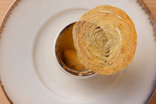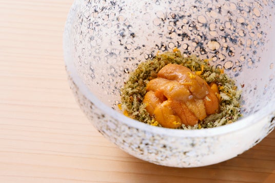 新鮮なウニを、ガーリック、青のりの入ったサクサクのパン粉の上に贅沢にのせました。オレンジとグレープフルーツの皮の爽やかな香りを加え、仕上げに香り高いすだち果汁をひとしずく。旨味、爽やかさ、柑橘の風味が絶妙に調和した一品です。ウニとパン粉のカリッとした食感のハーモニーを存分にお楽しみいただけます。