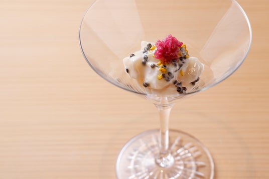 仕上げに梅酢で漬けたミョウガと柚子胡麻を添え、爽やかで上品なアクセントを演出。名酒「獺祭」の酒粕のまろやかさとキャビアの旨味が帆立の甘みを引き立てる逸品です。