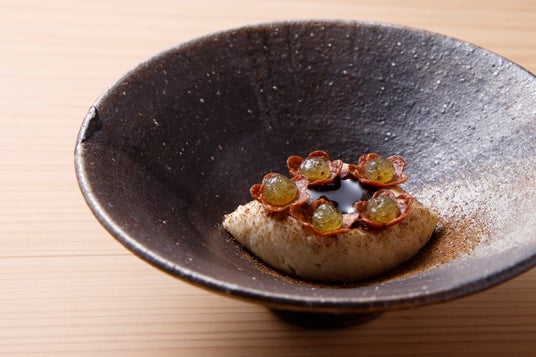 なめらかな甘酒のアイスクリームに、濃厚な大麦醤油キャラメルと麦茶のパウダーをふりかけました。花を象ったガヴォットの上に盛り付け、青のり香るきらめく柚子ゼリーで仕上げています。旨味と柑橘が調和し、爽やかで上品なコースの締めくくりに。
