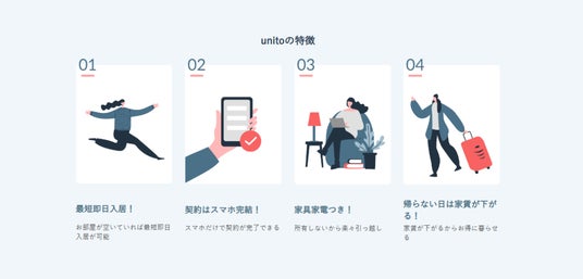 「unito」は、オンラインで契約を完結でき、最短即日で入居可能な部屋探しができるプラットフォームです。掲載されている部屋には、通常の賃貸で必要な家具・家電に加え、Wi-Fiや生活必需品も完備されており、スーツケース1つで手軽に引っ越しできます。